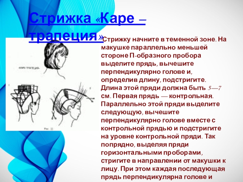 Слайд 56 Стрижку начните в теменной зоне. На макушке параллельно меньшей стороне
