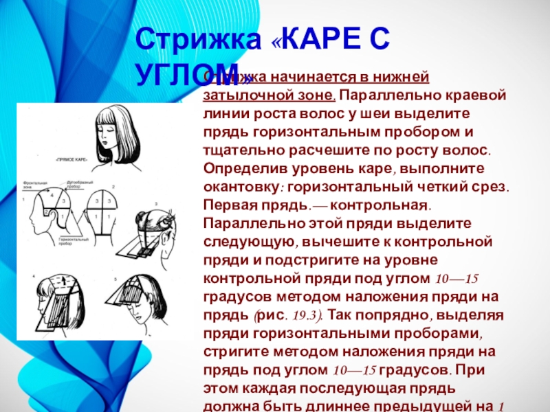 у шеи выделите прядь горизонтальным пробором и тщательно расчешите по росту волос. Определив уровень каре, выполните окантовку: горизонтальный четкий срез. Первая прядь.— контрольная. Параллельно этой пряди выделите следующую, вычешите к контрольной пряди и подстригите на уровне контрольной пряди под углом 10—15 градусов методом наложения пряди на прядь (рис. 19.3). Так попрядно, выделяя пряди горизонтальными проборами, стригите методом наложения пряди на прядь под углом 10—15 градусов. При этом каждая последующая прядь должна быть длиннее предыдущей на 1 —2 мм. Так стригите до горизонтального пробора, проходящего на уровне верха уха — зоны 1 и 2.