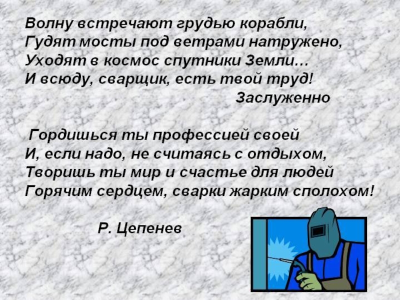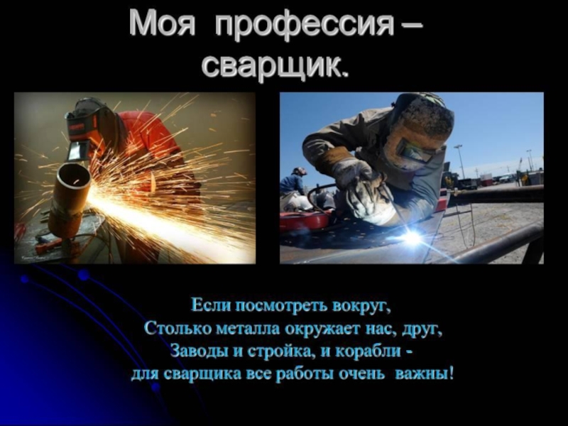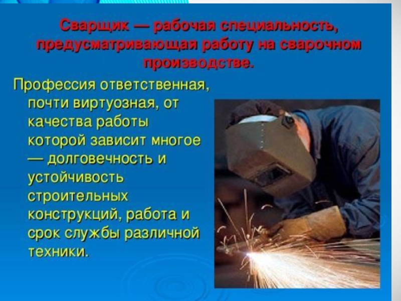 Слайд 18Сварщик — это специалист, занимающийся соединением металлических деталей, узлов. Стать квалифицированным