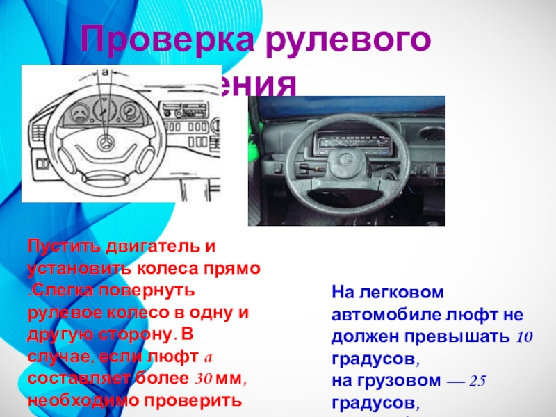 На легковом автомобиле люфт не должен превышать 10 градусов,
