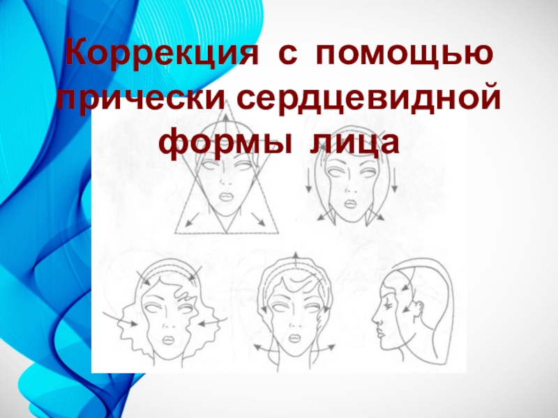 Слайд 44Коррекция с помощью прически сердцевидной формы лица