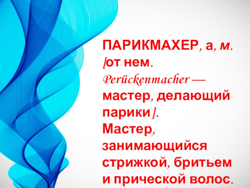 Слайд 40ПАРИКМАХЕР, а, м. [от нем. Perückenmacher — мастер, делающий парики].
