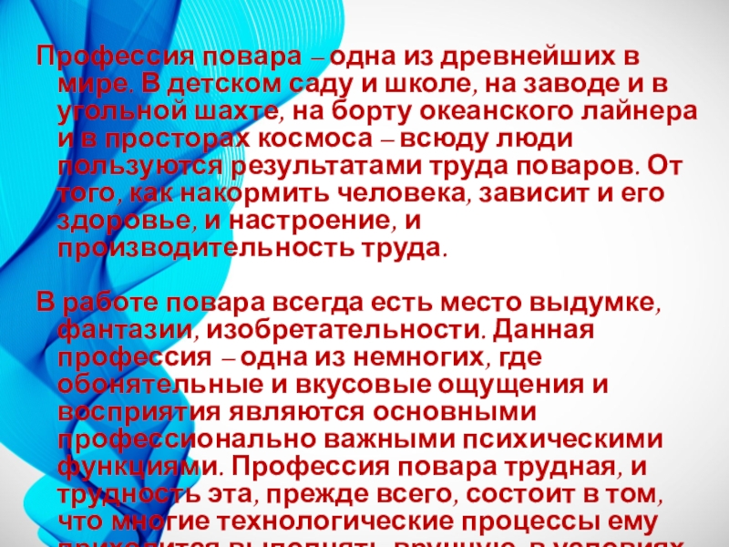 В работе повара всегда есть место выдумке, фантазии, изобретательности. Данная профессия – одна из немногих, где обонятельные и вкусовые ощущения и восприятия являются основными профессионально важными психическими функциями. Профессия повара трудная, и трудность эта, прежде всего, состоит в том, что многие технологические процессы ему приходится выполнять вручную, в условиях резких колебаний температуры. Поэтому успешно работать в данной профессии могут только профессионалы.