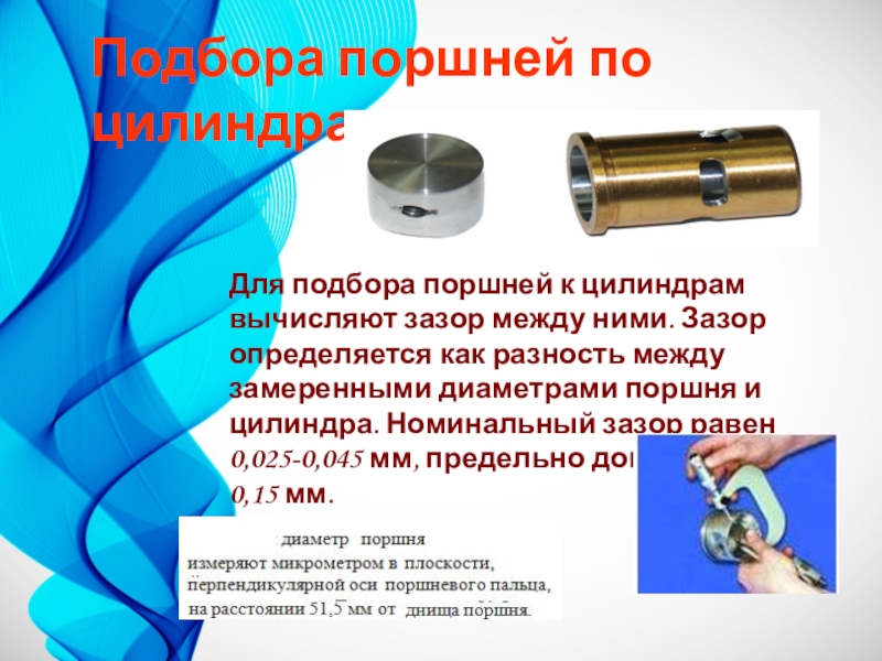 между ними. Зазор определяется как разность между замеренными диаметрами поршня и цилиндра. Номинальный зазор равен 0,025-0,045 мм, предельно допустимый – 0,15 мм.