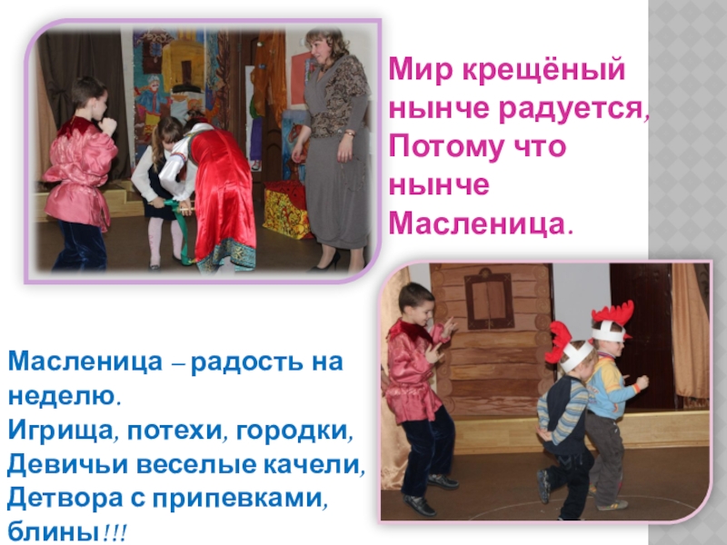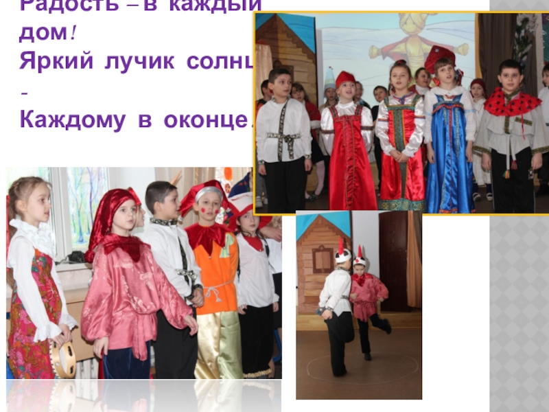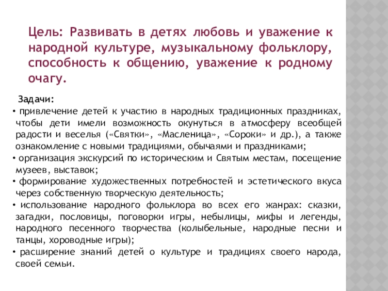 привлечение детей к участию в народных традиционных праздниках, чтобы дети имели возможность окунуться в атмосферу всеобщей радости и веселья («Святки», «Масленица», «Сороки» и др.), а также ознакомление с новыми традициями, обычаями и праздниками;