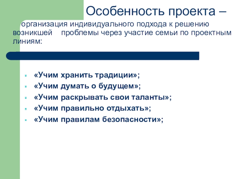 организация индивидуального подхода к решению возникшей проблемы через участие семьи по проектным линиям:
