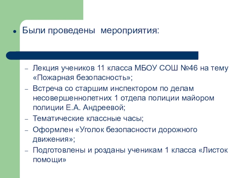 Встреча со старшим инспектором по делам несовершеннолетних 1 отдела полиции майором полиции Е.А. Андреевой;
