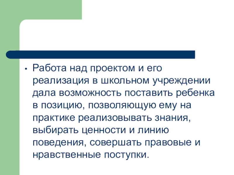 Работа над проектом и его реализация в школьном учреждении дала возможность