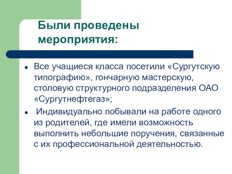 Организация коллективных экскурсий на предприятия, индивидуальное посещение детьми рабочих мест родителей;