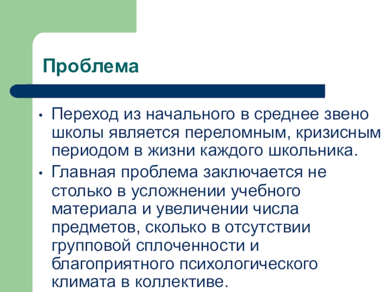 Главная проблема заключается не столько в усложнении учебного материала и увеличении числа предметов, сколько в отсутствии групповой сплоченности и благоприятного психологического климата в коллективе.