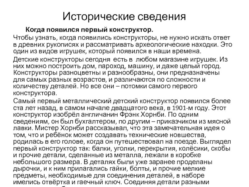 Самый первый металлический детский конструктор появился более ста лет назад, в самом начале двадцатого века, в 1901-м году. Этот конструктор изобрёл англичанин Фрэнк Хорнби. По одним сведениям, он был бухгалтером, по другим – приказчиком из мясной лавки. Мистер Хорнби рассказывал, что эта замечательная идея о том, что и ребёнок может создавать технические новшества, родилась в его голове, когда он путешествовал на поезде. Выглядел первый конструктор так: балки, уголки, перекрытия, колёсики, скобы и прочие детали, сделанные из металла, лежали в коробке небольшого размера. В деталях были уже заранее проделаны дырочки, и к ним прилагались гайки, болты, и прочие мелкие предметы, необходимые для соединения деталей, в наборе имелись отвёртка и гаечный ключ. Соединяя детали разными путями, можно было построить мосты, строительные краны, тележки, различные модели автомобилей.