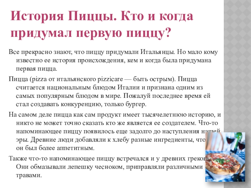 Цель: узнать как можно больше об истории возникновения пиццы, познакомить с видами пиццы, попробовать приготовить её самостоятельно.