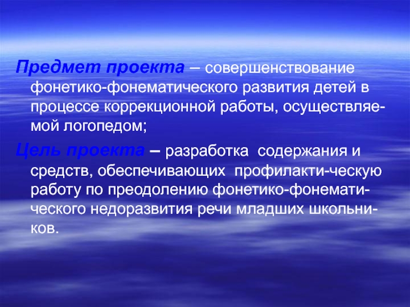 Предмет проекта – совершенствование фонетико-фонематического развития детей в процессе коррекционной работы, осуществляе-мой логопедом;Цель проекта – разработка содержания