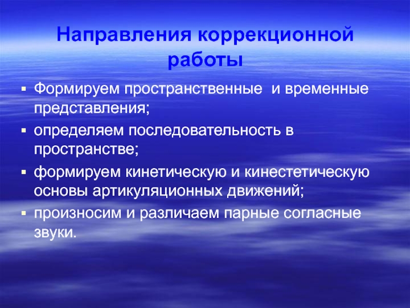 Направления коррекционной работыФормируем пространственные и временные представления;определяем последовательность в пространстве;формируем кинетическую и кинестетическую основы артикуляционных движений;произносим и