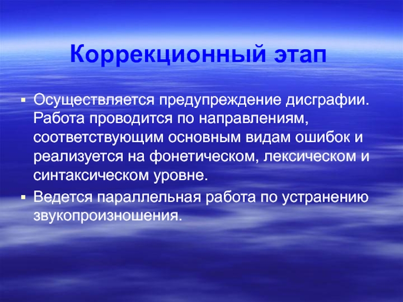 Коррекционный этапОсуществляется предупреждение дисграфии. Работа проводится по направлениям, соответствующим основным видам ошибок и реализуется на фонетическом, лексическом
