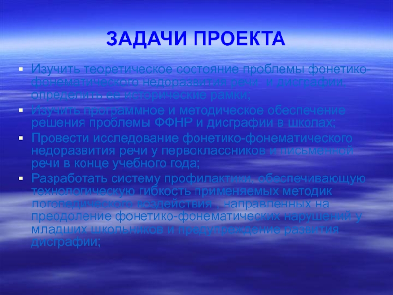 ЗАДАЧИ ПРОЕКТАИзучить теоретическое состояние проблемы фонетико-фонематического недоразвития речи и дисграфии, определить ее исторические рамки;Изучить программное и методическое