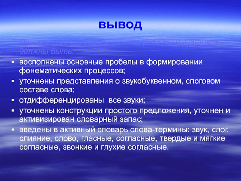 вывод  При завершении коррекционной работы у учащихся должны быть:восполнены основные пробелы в формировании фонематических процессов;уточнены представления