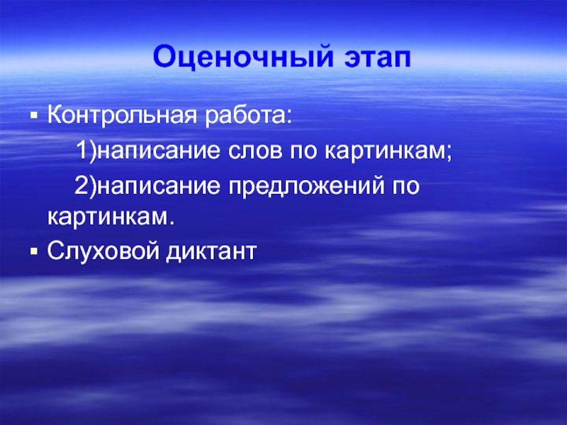 Оценочный этапКонтрольная работа:    1)написание слов по картинкам;    2)написание предложений по картинкам.Слуховой