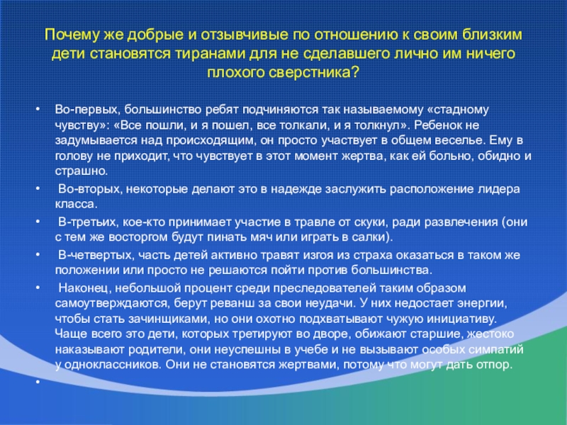 Во-первых, большинство ребят подчиняются так называемому «стадному чувству»: «Все пошли, и я пошел, все толкали, и я толкнул». Ребенок не задумывается над происходящим, он просто участвует в общем веселье. Ему в голову не приходит, что чувствует в этот момент жертва, как ей больно, обидно и страшно.