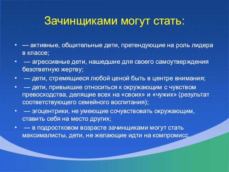 — в подростковом возрасте зачинщиками могут стать максималисты, дети, не желающие идти на компромисс.