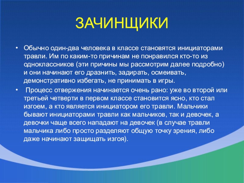 Процесс отвержения начинается очень рано: уже во второй или третьей четверти в первом классе становится ясно, кто стал изгоем, а кто является инициатором его травли. Мальчики бывают инициаторами травли как мальчиков, так и девочек, а девочки чаще всего нападают на девочек (в случае травли мальчика либо просто разделяют общую точку зрения, либо даже начинают защищать изгоя).