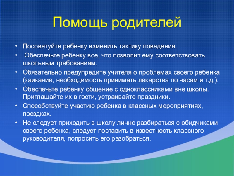 Обязательно предупредите учителя о проблемах своего ребенка (заикание, необходимость принимать лекарства по часам и т.д.).