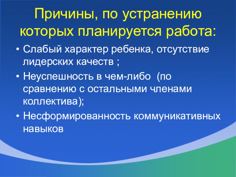 Слайд 15Причины, по устранению которых планируется работа: