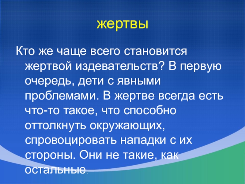 с явными проблемами. В жертве всегда есть что-то такое, что способно оттолкнуть окружающих, спровоцировать нападки с их стороны. Они не такие, как остальные.
