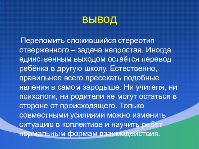 выходом остаётся перевод ребёнка в другую школу. Естественно, правильнее всего пресекать подобные явления в самом зародыше. Ни учителя, ни психологи, ни родители не могут остаться в стороне от происходящего. Только совместными усилиями можно изменить ситуацию в коллективе и научить ребят нормальным формам взаимодействия.