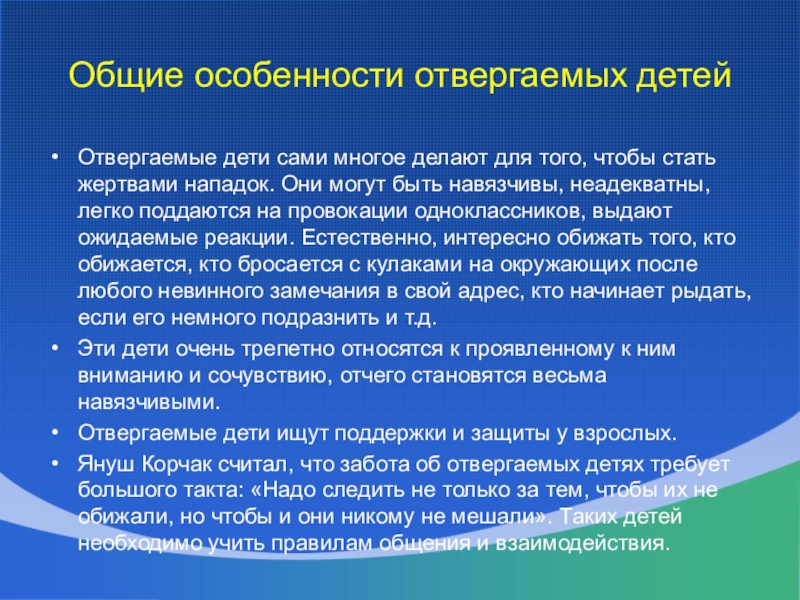 Януш Корчак считал, что забота об отвергаемых детях требует большого такта: «Надо следить не только за тем, чтобы их не обижали, но чтобы и они никому не мешали». Таких детей необходимо учить правилам общения и взаимодействия.