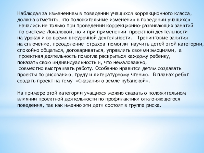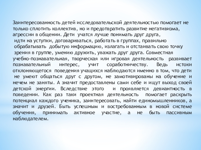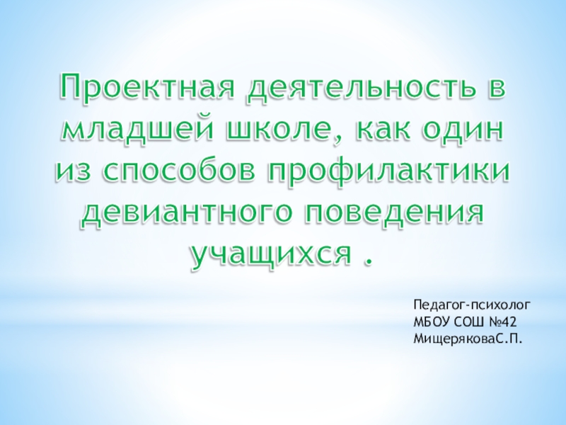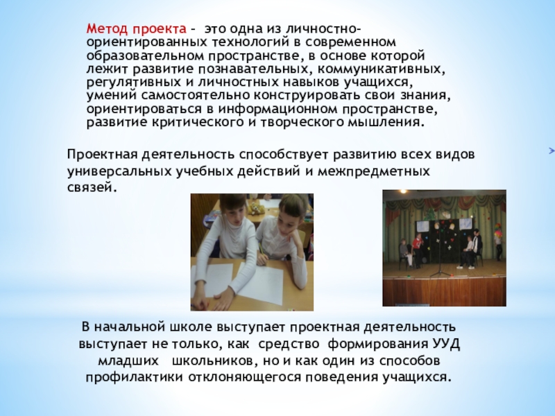 В начальной школе выступает проектная деятельность выступает не только, как средство формирования УУД младших школьников, но и как один из способов профилактики отклоняющегося поведения учащихся.