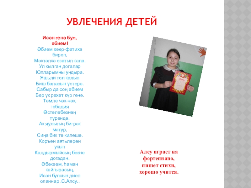 Алсу играет на фортепиано, пишет стихи, хорошо учится.