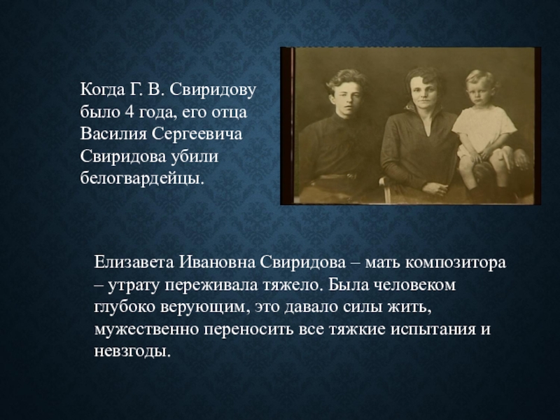 Елизавета Ивановна Свиридова – мать композитора – утрату переживала тяжело. Была человеком глубоко верующим, это давало силы жить, мужественно переносить все тяжкие испытания и невзгоды.