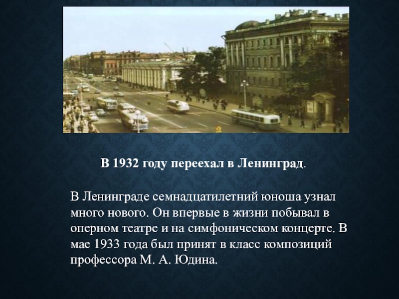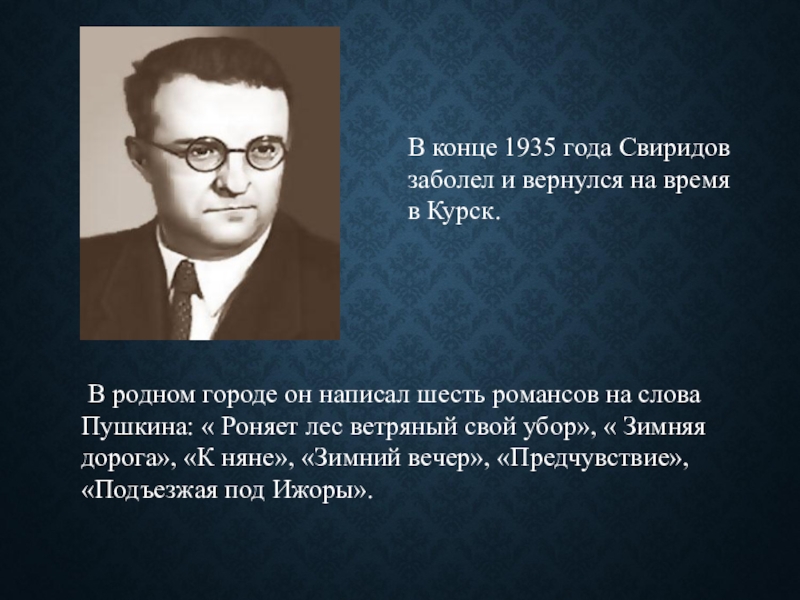 В родном городе он написал шесть романсов на слова Пушкина: « Роняет лес ветряный свой убор», « Зимняя дорога», «К няне», «Зимний вечер», «Предчувствие», «Подъезжая под Ижоры».