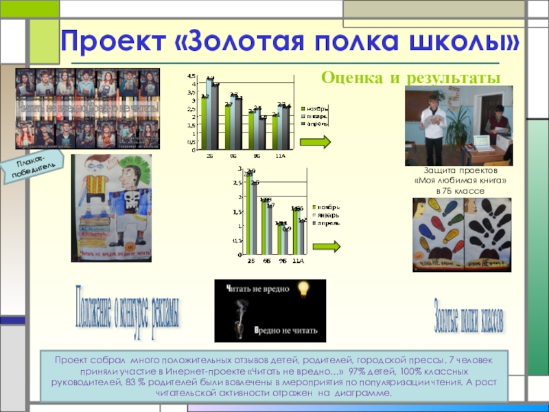 В дальнейшем ходе реализации проекта учащиеся вместе с родителями и учителями участвуют в системе массовых мероприятий по популяризации чтения (проводят классные часы, собрания, пишут сочинения, создают социальную рекламу чтения). Итогом становится конкретный продукт -–тематический выпуск школьной газеты и «золотые полки классов»