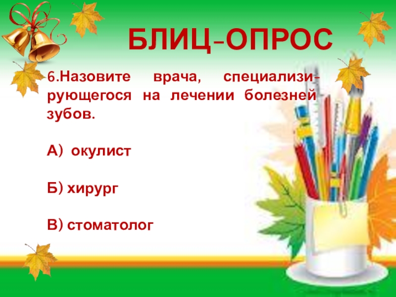 БЛИЦ-ОПРОС6.Назовите врача, специализи-рующегося на лечении болезней зубов.А) окулистБ) хирургВ) стоматолог