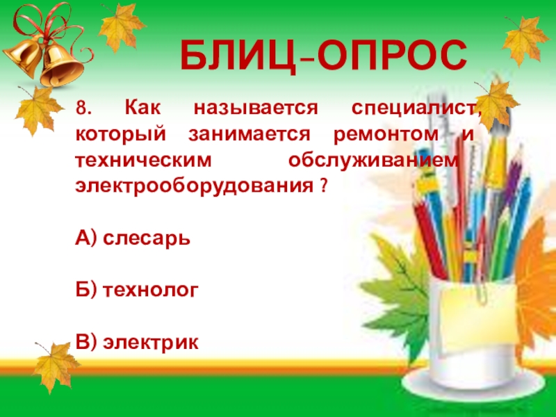 БЛИЦ-ОПРОС8. Как называется специалист, который занимается ремонтом и техническим обслуживанием электрооборудования ?А) слесарь Б) технологВ) электрик