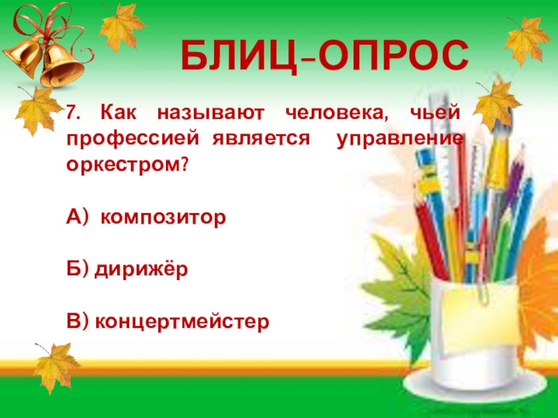 БЛИЦ-ОПРОС7. Как называют человека, чьей профессией является управление оркестром?А) композиторБ) дирижёрВ) концертмейстер