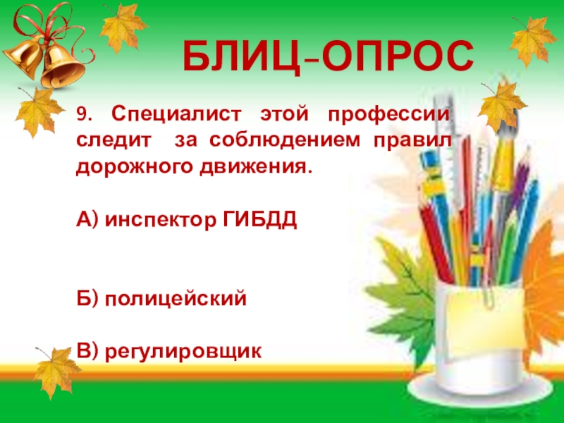 БЛИЦ-ОПРОС9. Специалист этой профессии следит за соблюдением правил дорожного движения.А) инспектор ГИБДДБ) полицейскийВ) регулировщик