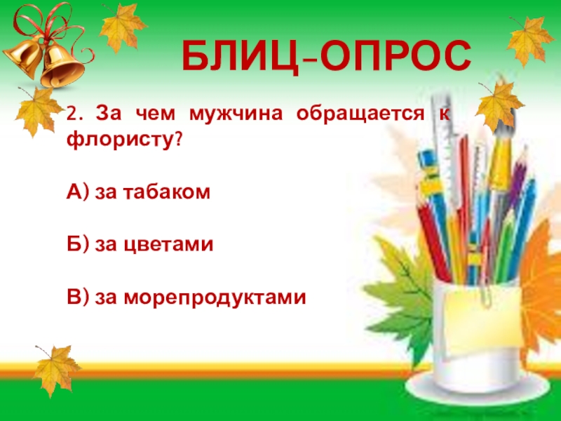 БЛИЦ-ОПРОС2. За чем мужчина обращается к флористу?А) за табакомБ) за цветамиВ) за морепродуктами