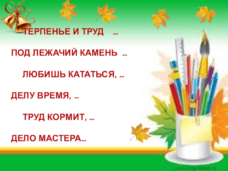 ТЕРПЕНЬЕ И ТРУД  … ПОД ЛЕЖАЧИЙ КАМЕНЬ …  	ЛЮБИШЬ КАТАТЬСЯ, …ДЕЛУ ВРЕМЯ, …	ТРУД КОРМИТ, …ДЕЛО