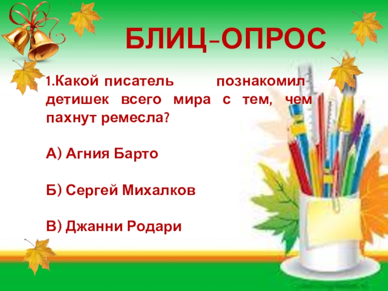 БЛИЦ-ОПРОС1.Какой	писатель познакомил детишек всего мира с тем, чем пахнут ремесла?А) Агния БартоБ) Сергей МихалковВ) Джанни Родари