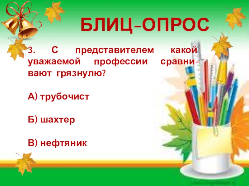 БЛИЦ-ОПРОС3. С представителем какой уважаемой профессии сравни-вают грязнулю?А) трубочистБ) шахтерВ) нефтяник