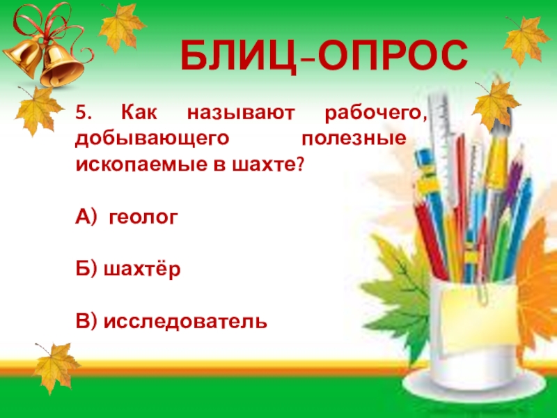 БЛИЦ-ОПРОС5. Как называют рабочего, добывающего полезные ископаемые в шахте?А) геологБ) шахтёрВ) исследователь