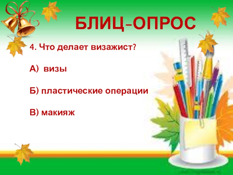 БЛИЦ-ОПРОС4. Что делает визажист?А) визыБ) пластические операцииВ) макияж