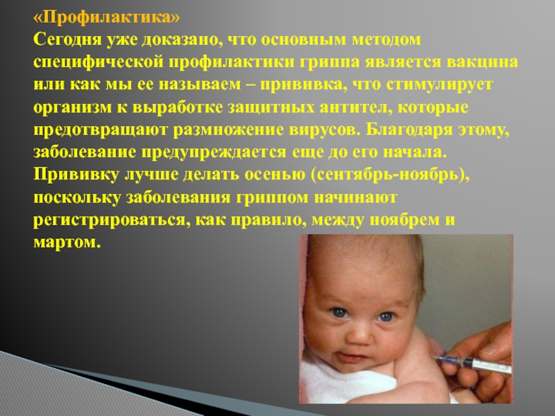 или как мы ее называем – прививка, что стимулирует организм к выработке защитных антител, которые предотвращают размножение вирусов. Благодаря этому, заболевание предупреждается еще до его начала. Прививку лучше делать осенью (сентябрь-ноябрь), поскольку заболевания гриппом начинают регистрироваться, как правило, между ноябрем и мартом.