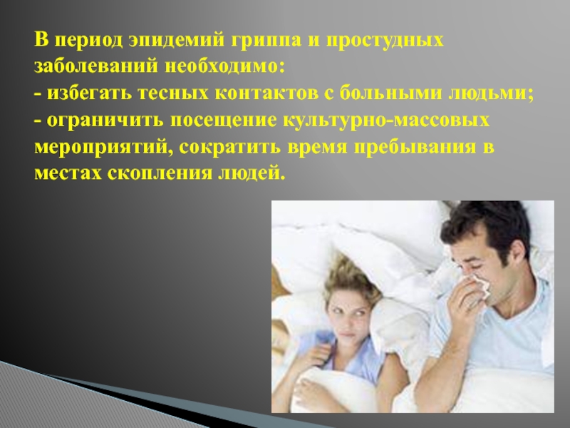 Слайд 12В период эпидемий гриппа и простудных заболеваний необходимо: