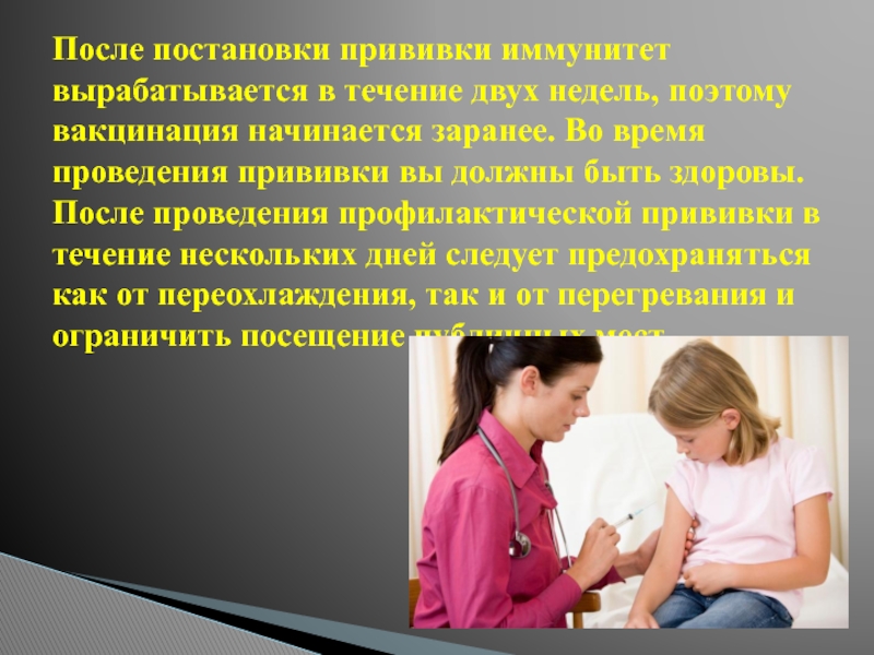Слайд 7После постановки прививки иммунитет вырабатывается в течение двух недель, поэтому вакцинация