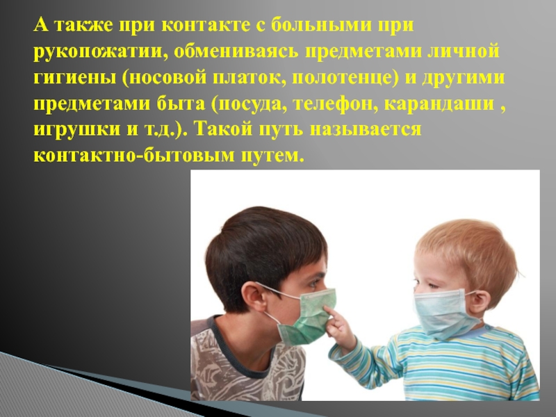 гигиены (носовой платок, полотенце) и другими предметами быта (посуда, телефон, карандаши , игрушки и т.д.). Такой путь называется контактно-бытовым путем.