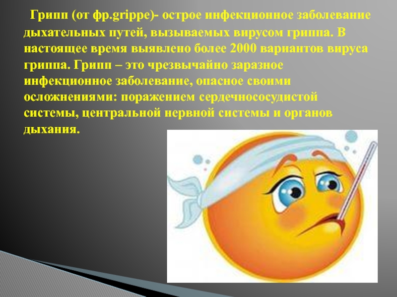 Слайд 2 Грипп (от фр.grippe)- острое инфекционное заболевание дыхательных путей, вызываемых вирусом гриппа. В